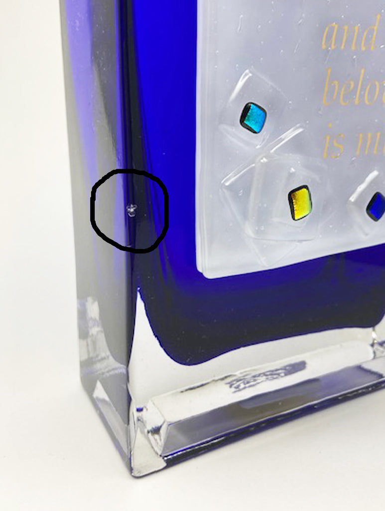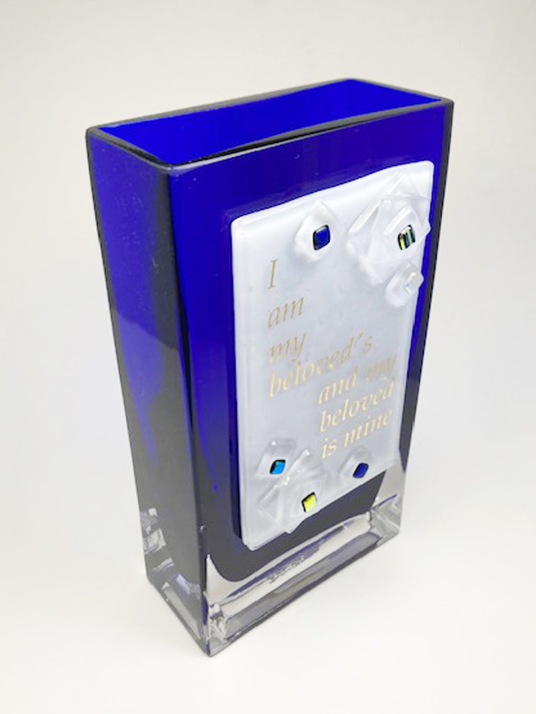 This beautiful cobalt blue vase, adorned with our fused glass plaque inscribed “I am my beloved’s, and my beloved is mine,” has long been one of our most cherished designs. Its rich color and timeless message make it a meaningful piece for weddings, anniversaries, or simply as a celebration of love.